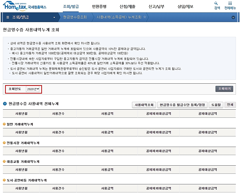 사용내역(소득공제) 누계 조회를 클릭하시면 아래와 같이 조회 연도별 조회를 할 수 있는데요. 중고자동차 거래금액의 10%가 공제대상 금액이며, 전통시장 거래내역의 신용카드 등 사용금액 소득공제율은 40%로 일반 거래 소득공제율 30%보다 우선 적용이 된다고 합니다.