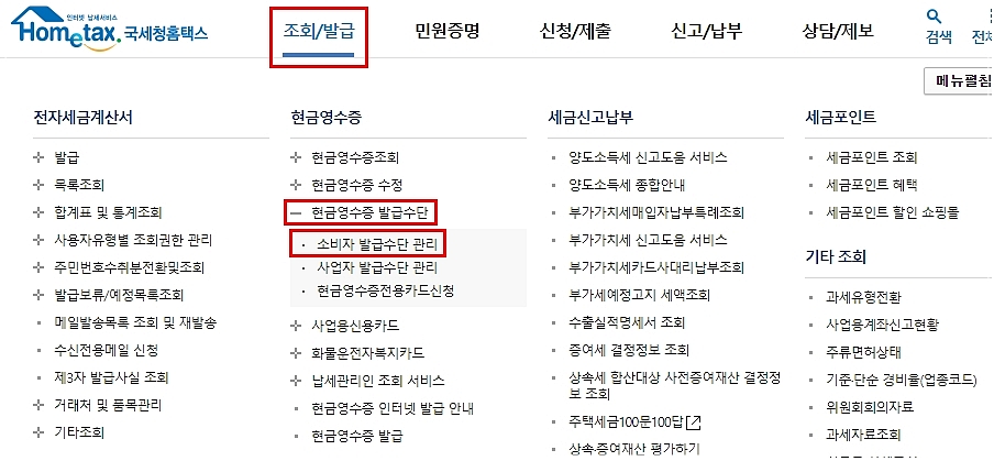 국세청 현금영수증 홈페이지 에 접속하시면 아래와 같이 나오는데요. 조회/발급 마우스를 가져가시면 전체 메뉴를 볼 수 있으며, 현금영수증 쪽에 현금영수증 발급수단을 클릭하시면, 소비자 발급수단 관리가 나오는데 클릭합니다.