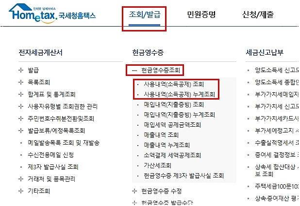 국세청 현금영수증 조회는 상단 메뉴에 조회/발급에서 현금영수증을 클릭하시면 사용내역(소득공제) 조회와 누계 조회가 있는데요.