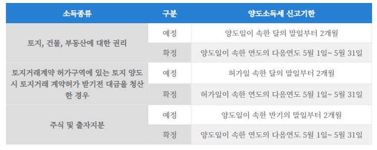 예정신고와 확정신고에 따른 신고기한이 다른데요. 아래 표를 참고해주세요.