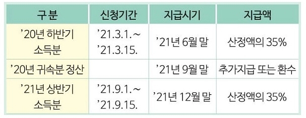 반기 신청제도는 한 번만 신청하면 두 번째 신청 및 정기 신청은 별도로 하지 않아도 되며, 반기 신청으로 받을 금액이 15만 원 미만인 경우 정기분에 합산되어 정산 지급되는데요. 2021년 5월에 신청하는 정기 신청은 1년 치를 한 번에 신청하여 9월에 한 번 받는 것으로 최종 수령 금액은 반기 제도와 똑같습니다.