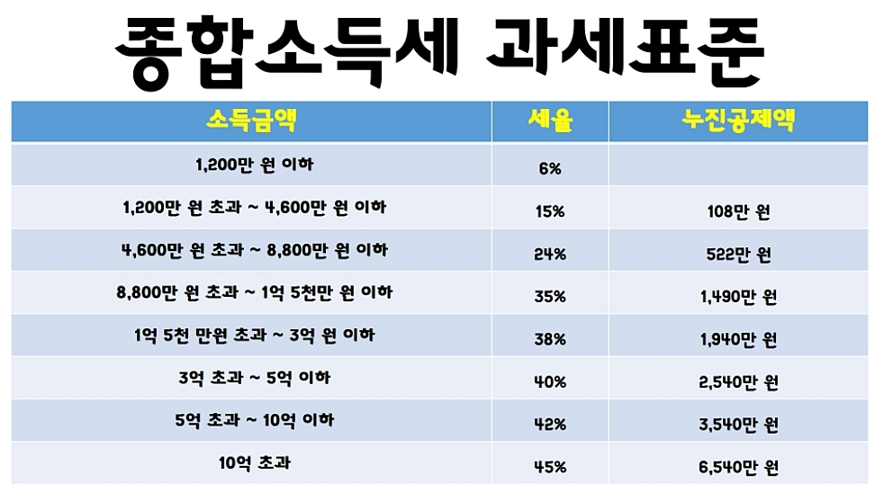 과세표준은 1년 동안 발생한 이자소득, 배당소득, 근로소득, 사업소득, 연금소득, 기타 소득을 합산하여 여러 가지 공제를 뺀 금액이라고 하는데요. 2021년부터 종합소득세 최고세율이 인상되면서 2021년 귀속부터는 과세표준 10억 초과 시 42%가 아닌 45%의 세율이 적용된다고 합니다.