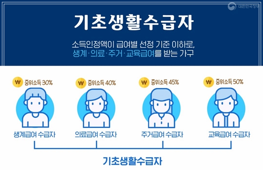 기초생활수급자는 소득 인정액이 중위소득의 30%~50%로 최저 생계비에 못 미치는 사람을 말하는 것인데요. 기초생활수급자가 되면 기초생활수급비를 지원받게 되며, 정부에서 지원하는 기초생활수급비의 종류는 4가지입니다. 바로 의료급여, 주거급여, 교육급여, 생계급여인데요.