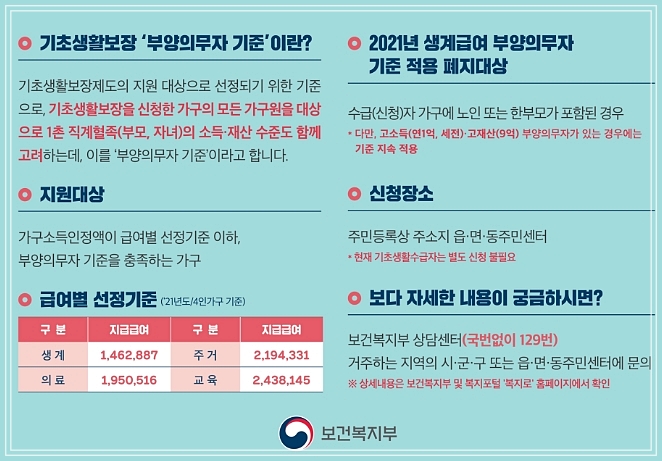 부양의무자가 범위는 수급권자 1촌 직계혈족을 의미하는데요. 다만, 사망한 1촌의 직계혈족의 배우자는 제외하며, 부양의무자가 없거나 부양의무자가 있어도 부양능력이 없거나 또는 부양을 받을 수 없는 경우가 해당된다고 합니다. 부양능력 유무는 소득 및 재산이 기준이 되며, 개인단위 보장에 다른 수급권자 범위 특례는 의료급여와 자활급여로 구분하여 지급한다고 합니다.